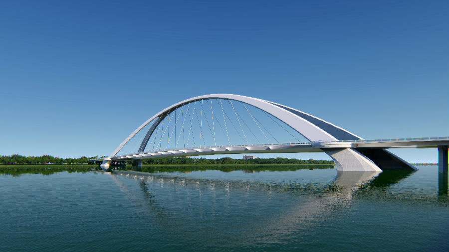 “撫音悅迎八方客,砥礪奮進(jìn)謀新篇”,寓意綿陽科技城在現(xiàn)代化建設(shè)歷程中,以開放、包容的姿態(tài)不斷迎接著新事物,開拓創(chuàng)新,與時(shí)代接軌互聯(lián)。“撫琴譜韻”為主跨243m提籃拱,主拱猶如張開的風(fēng)琴般奏出美妙的音樂,簡約唯美。兩翼出挑的人行道猶如張開的雙臂,豐富行人感官體驗(yàn),與主拱共同譜寫出一曲浪漫的現(xiàn)代樂章,全橋視覺通透性好,有著強(qiáng)烈的韻律感。
