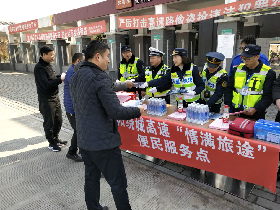1 月 21 日,綿陽繞城高速管理所聯(lián)合高速交通執(zhí)法、高速交警 在綿陽南服務(wù)區(qū)舉行了綿陽繞城高速 2019 年春運暨“情滿旅途” 活動啟動儀式。儀式現(xiàn)場設(shè)立了“春運安全 情滿旅途”宣傳點 和便民服務(wù)點,積極開展了咨詢引導(dǎo)、秩序維護、便民利民、應(yīng) 急救護等便民服務(wù)工作,主動為過往司乘人員特別是農(nóng)民工提供 開水藥品、交通咨詢、車輛維修、應(yīng)急救援等暖心服務(wù),充分讓農(nóng)民工兄弟感受到回鄉(xiāng)返崗旅途的溫暖,增進了人民群眾對綿陽 繞城高速春運服務(wù)的獲得感和認(rèn)同感。為確保綿陽繞城高速春運 期間安全營運奠定了堅實的基礎(chǔ)。