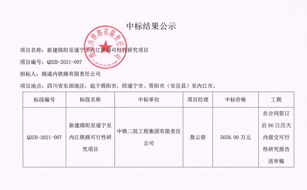 新建綿陽至遂寧至內(nèi)江鐵路可行性研究項目中標結(jié)果公示