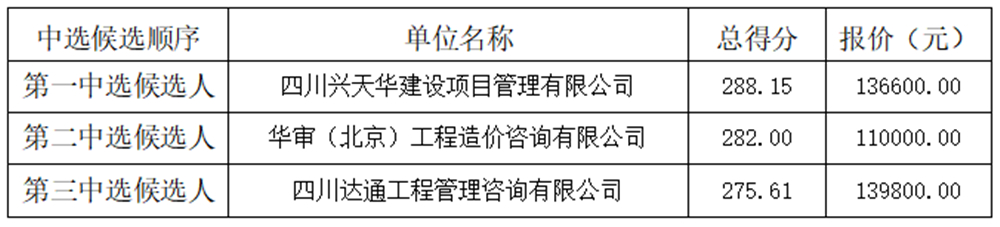 四川久安工程管理有限公司(以下簡稱“代理機(jī)構(gòu)”)組織比選的“增加城市科技元素(一期)項(xiàng)目結(jié)算審計(jì)服務(wù)”項(xiàng)目(項(xiàng)目編號:四川久安比選[2021]4號),于2021年09月14日10時30分(北京時間)由比選小組評審,招標(biāo)人代表、現(xiàn)場監(jiān)督人員參加。本次評比小組依法評比結(jié)果及授標(biāo)建議如下: