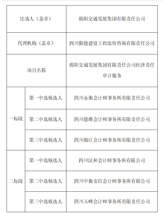 綿陽(yáng)交通發(fā)展集團(tuán)有限責(zé)任公司經(jīng)濟(jì)責(zé)任審計(jì)服務(wù)比選中選候選人公示