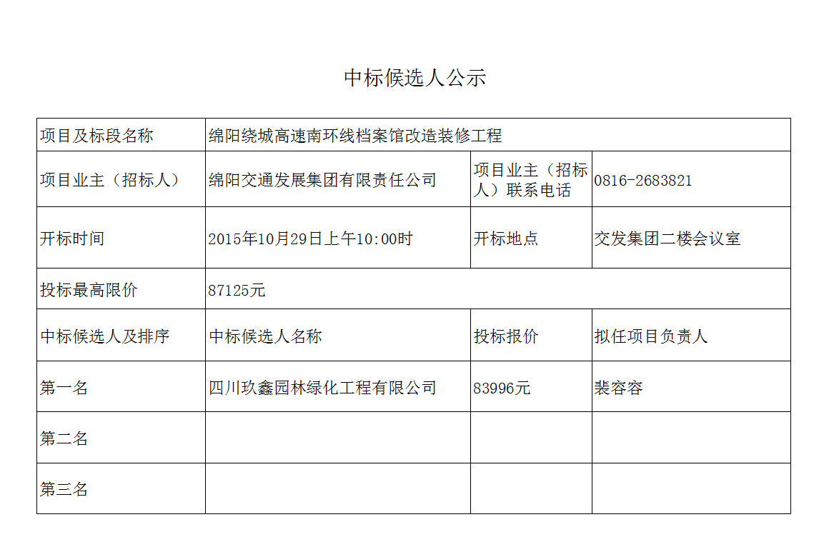綿陽繞城高速南環(huán)線檔案館改造裝修工程中標候選人公示