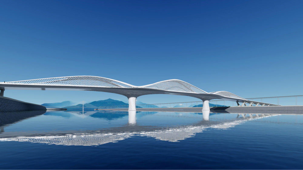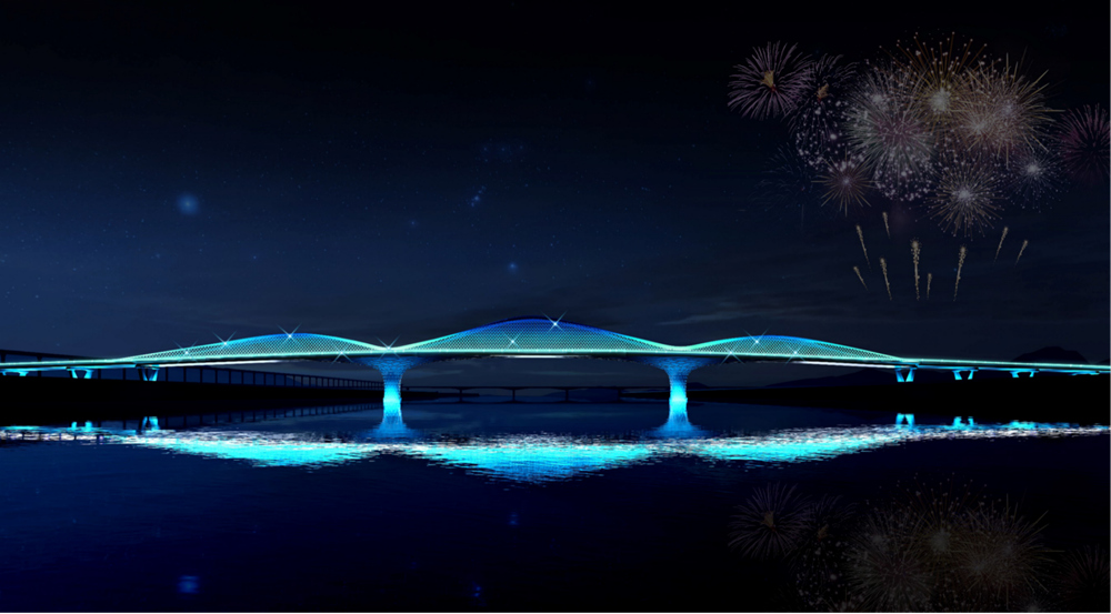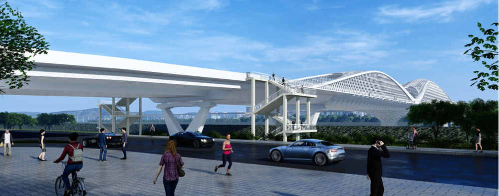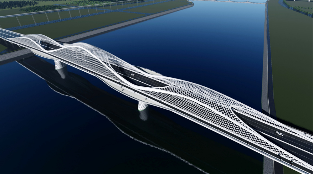 橋梁為主跨180m 連續(xù)梁橋,橋面設(shè)置層次豐富的空間網(wǎng)狀構(gòu)架,造型設(shè)計(jì)新穎,猶如在時(shí)空之隧中穿梭,體現(xiàn)綿陽科技之城不斷探求未知世界、永攀科技高峰精神?! ?/p>