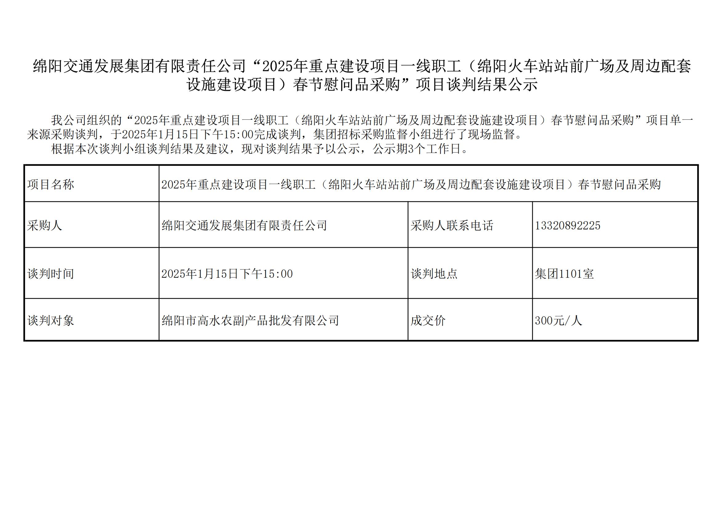 綿陽交通發(fā)展集團(tuán)有限責(zé)任公司“2025年重點(diǎn)建設(shè)項(xiàng)目一線職工(綿陽火車站站前廣場(chǎng)及周邊配套設(shè)施建設(shè)項(xiàng)目)春節(jié)慰問品采購”項(xiàng)目談判結(jié)果公示