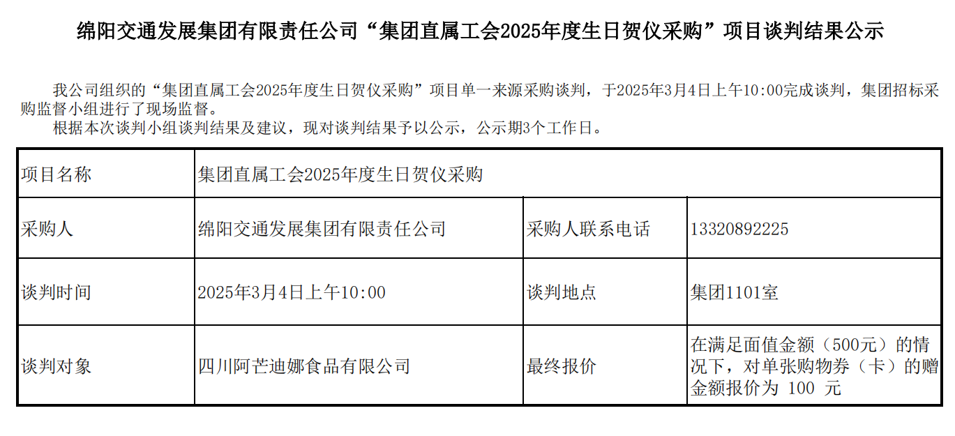 綿陽交通發(fā)展集團有限責任公司“集團直屬工會2025年度生日賀儀采購”項目談判結果公示