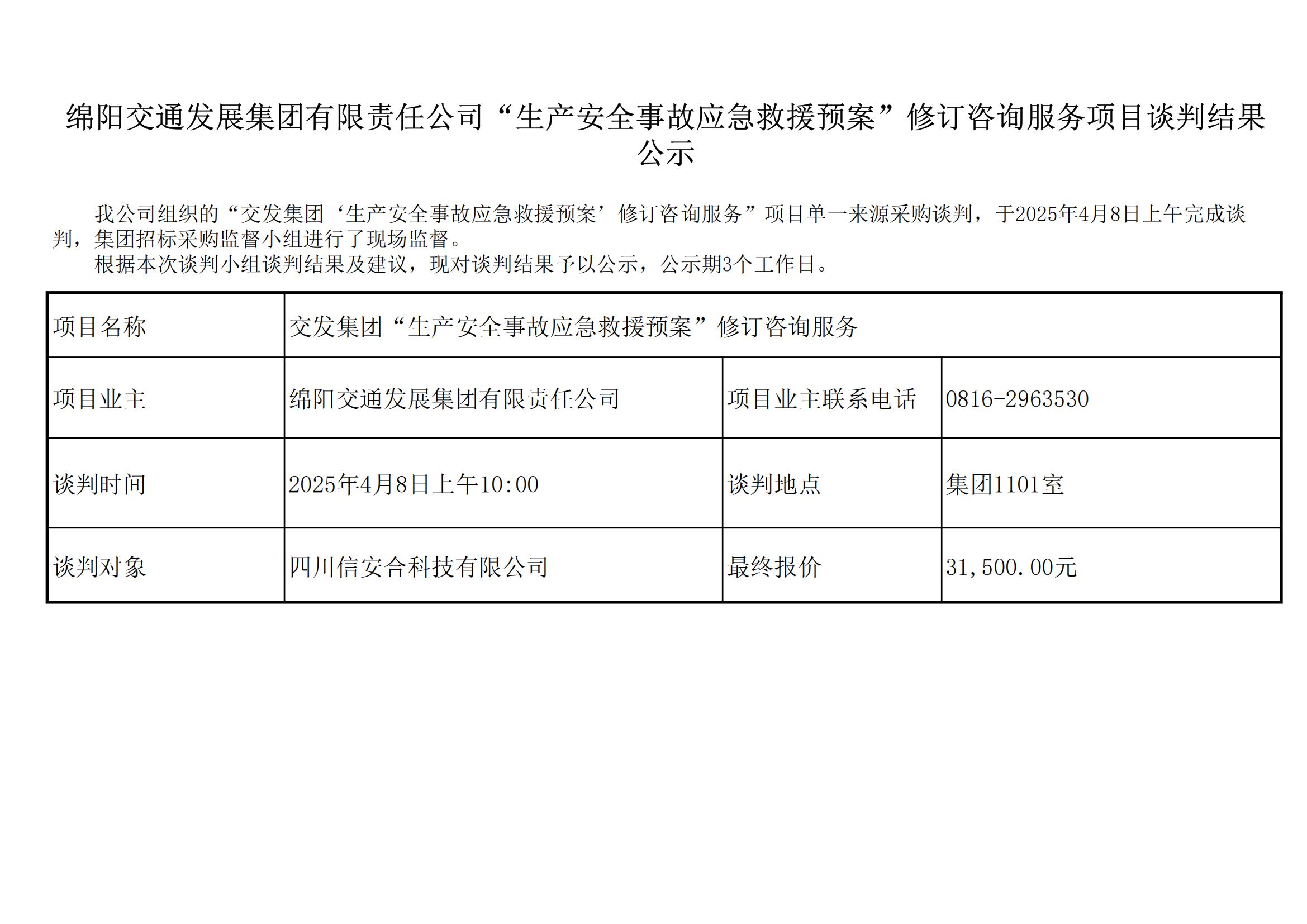 綿陽(yáng)交通發(fā)展集團(tuán)有限責(zé)任公司 “生產(chǎn)安全事故應(yīng)急救援預(yù)案”修訂咨詢服務(wù)項(xiàng)目談判結(jié)果公示
