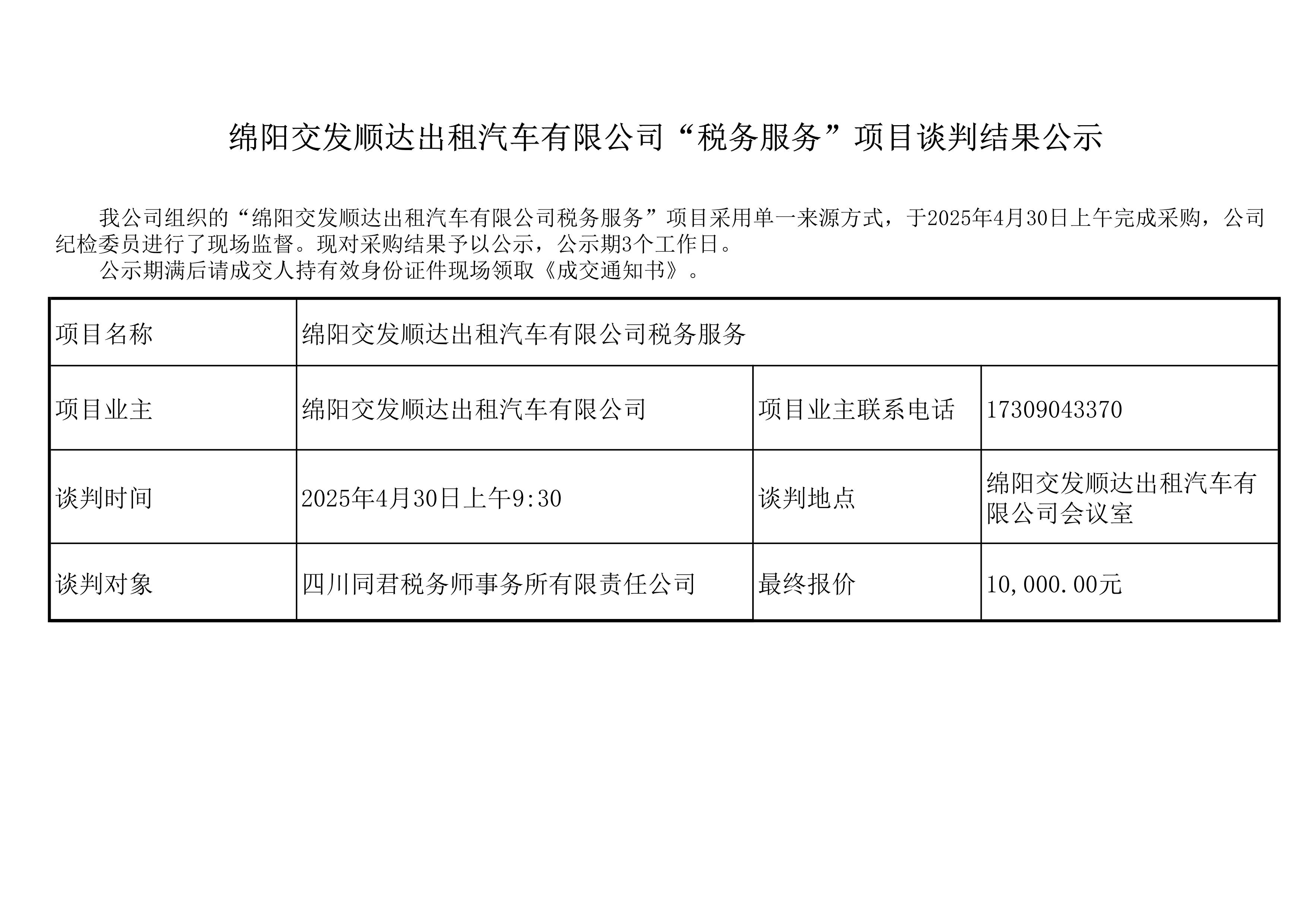 綿陽(yáng)交發(fā)順達(dá)出租汽車有限公司“稅務(wù)服務(wù)”項(xiàng)目談判結(jié)果公示
