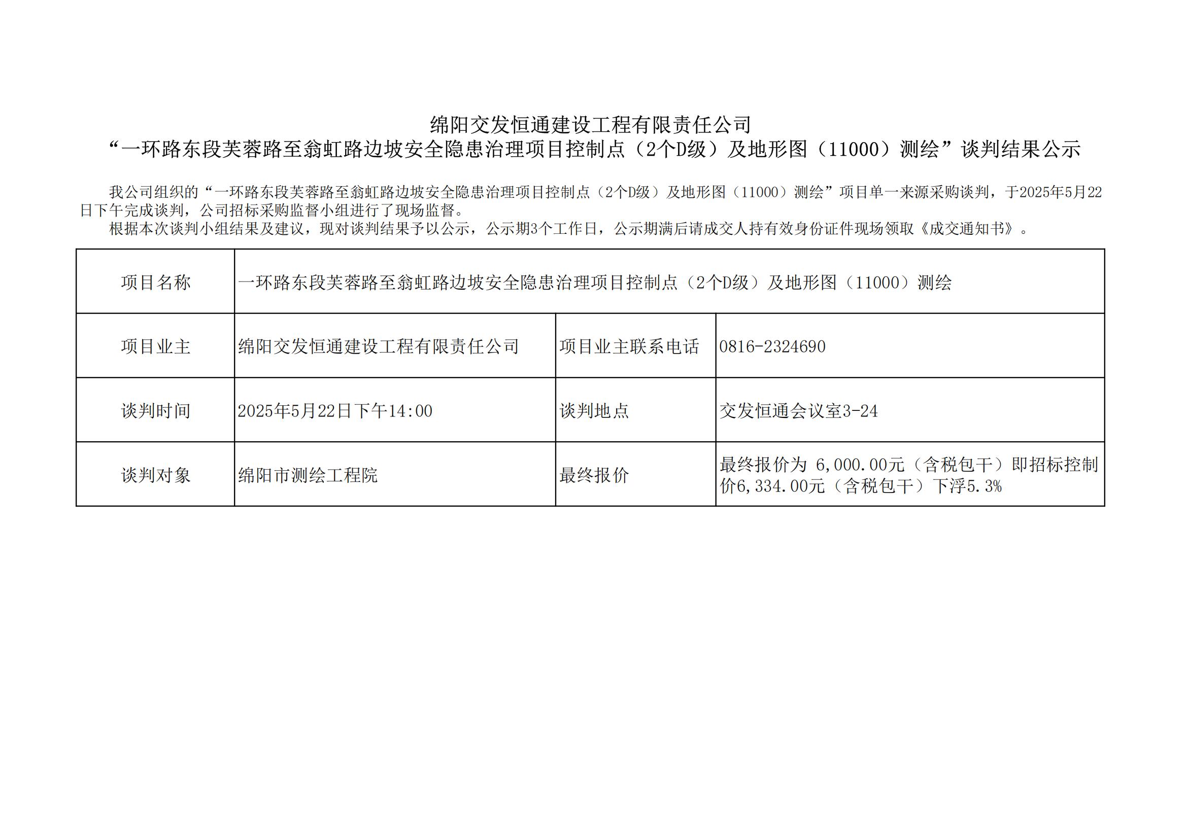 綿陽交發(fā)恒通建設工程有限責任公司一環(huán)路東段芙蓉路至翁虹路邊坡安全隱患治理項目控制點(2個D級)及地形圖(11000)測繪談判結(jié)果公示