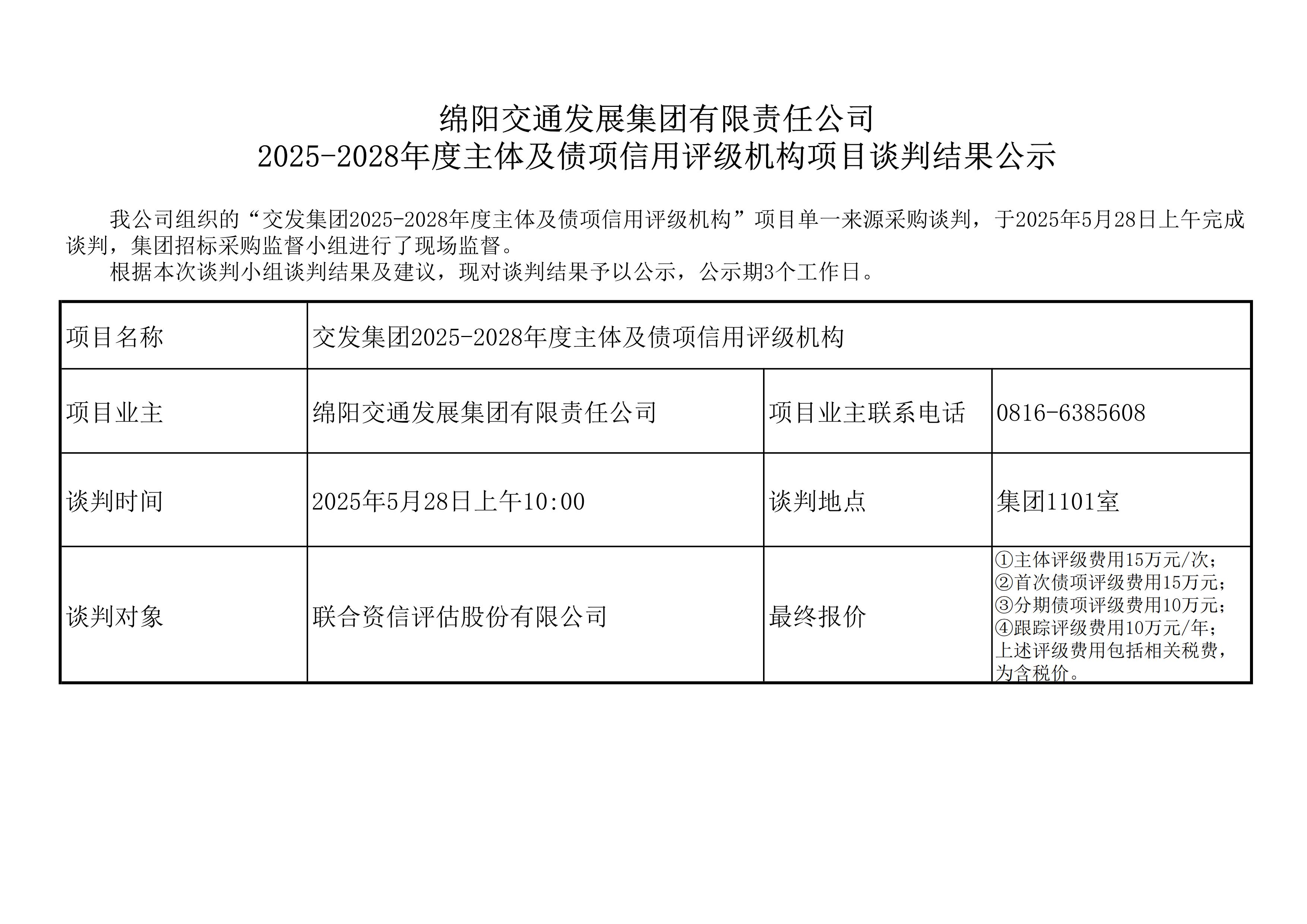 綿陽(yáng)交通發(fā)展集團(tuán)有限責(zé)任公司2025-2028年度主體及債項(xiàng)信用評(píng)級(jí)機(jī)構(gòu)項(xiàng)目談判結(jié)果公示