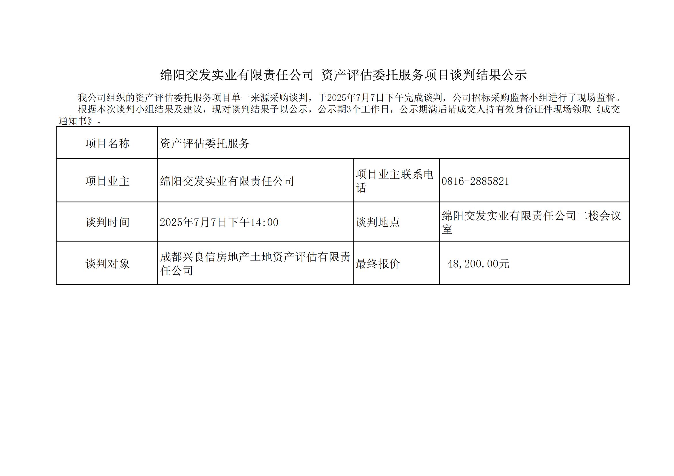綿陽交發(fā)實業(yè)有限責任公司資產評估委托服務項目談判結果公示