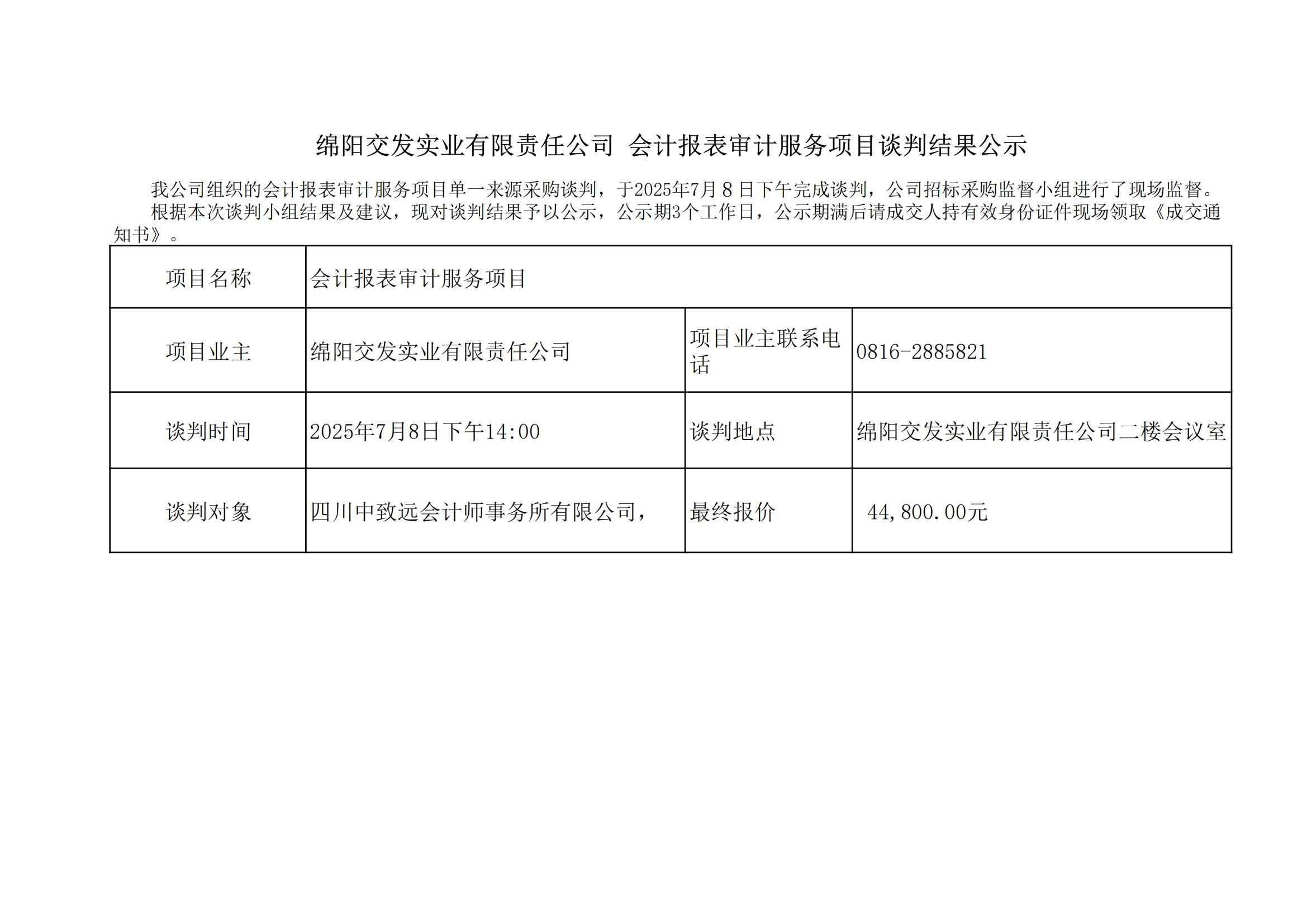 綿陽交發(fā)實業(yè)有限責任公司會計報表審計服務項目談判結果公示
