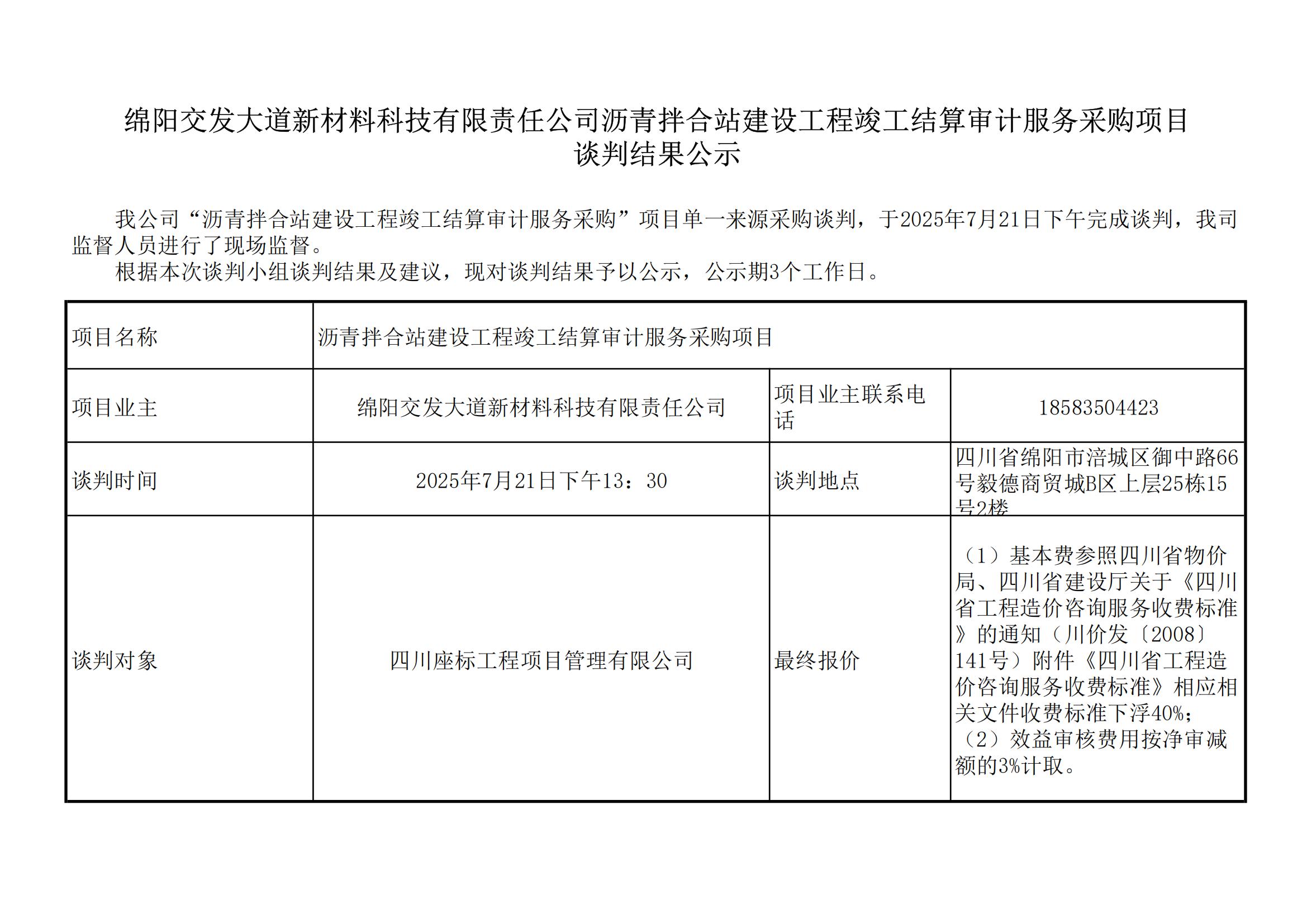 綿陽交發(fā)大道新材料科技有限責(zé)任公司瀝青拌合站建設(shè)工程竣工結(jié)算審計(jì)服務(wù)采購項(xiàng)目談判結(jié)果公示