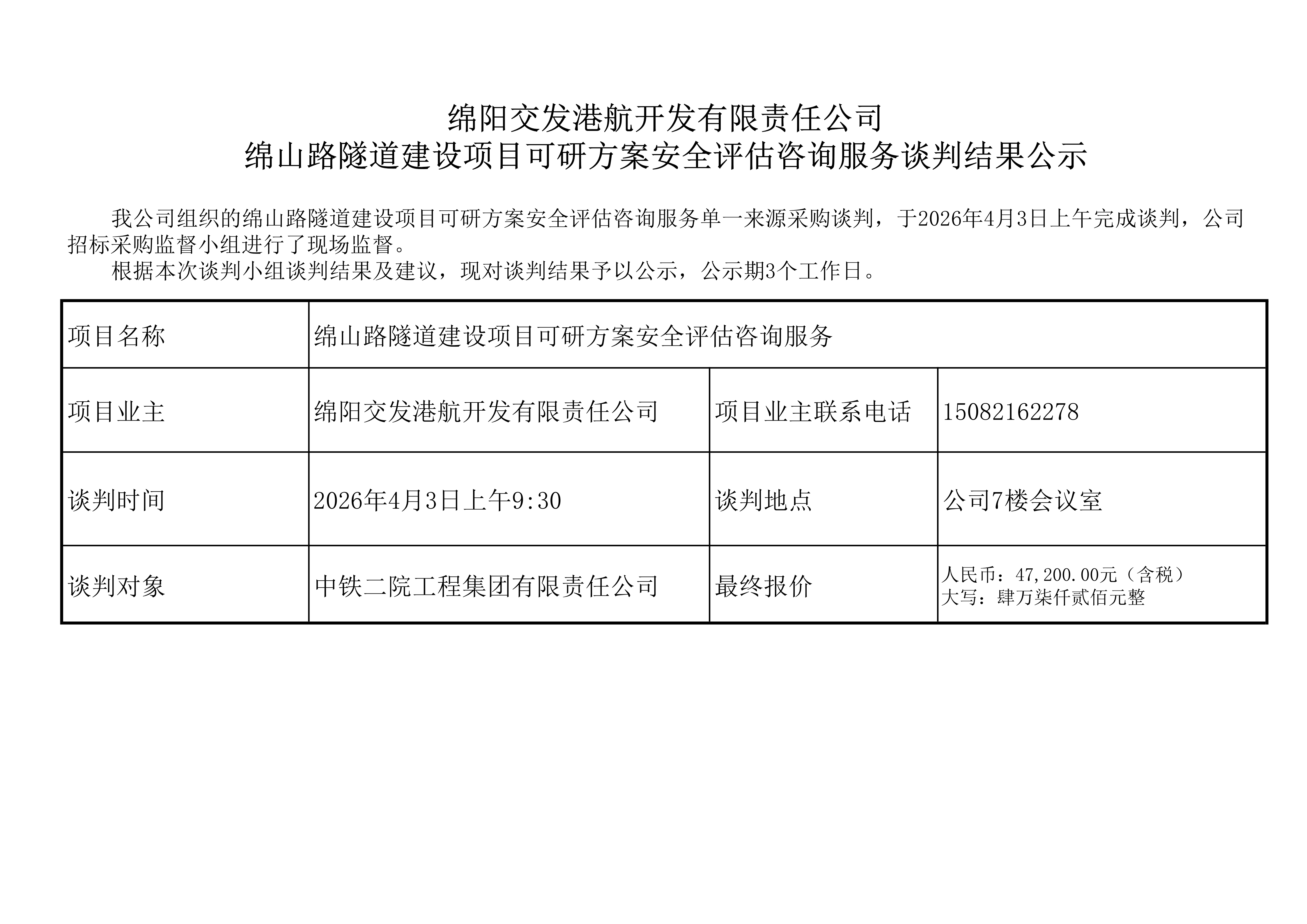 綿陽交發(fā)港航開發(fā)有限責(zé)任公司 綿山路隧道建設(shè)項(xiàng)目可研方案安全評(píng)估咨詢服務(wù)談判結(jié)果公示