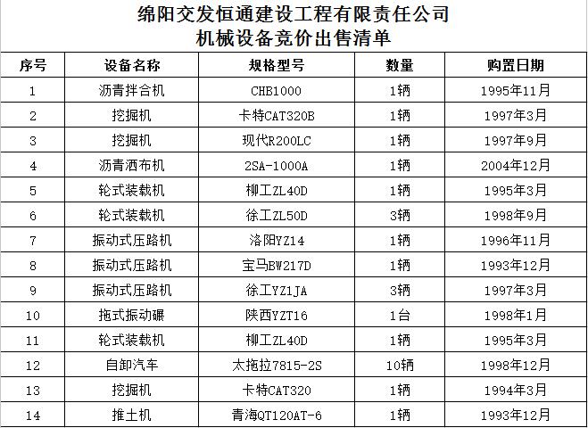 綿陽交發(fā)恒通建設(shè)工程有限責(zé)任公司關(guān)于競價出售舊機(jī)械設(shè)備的公告