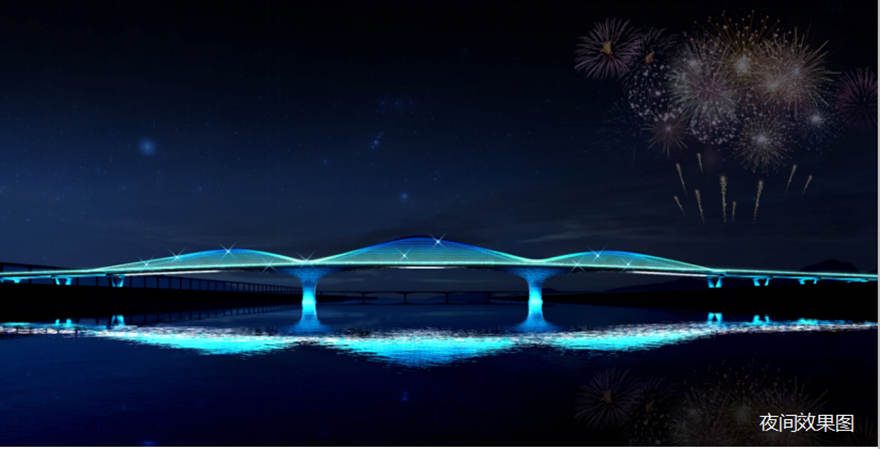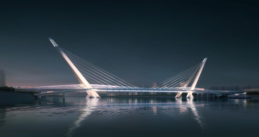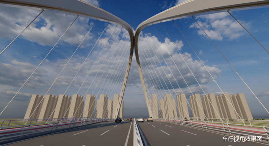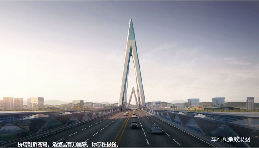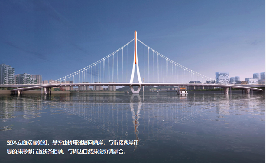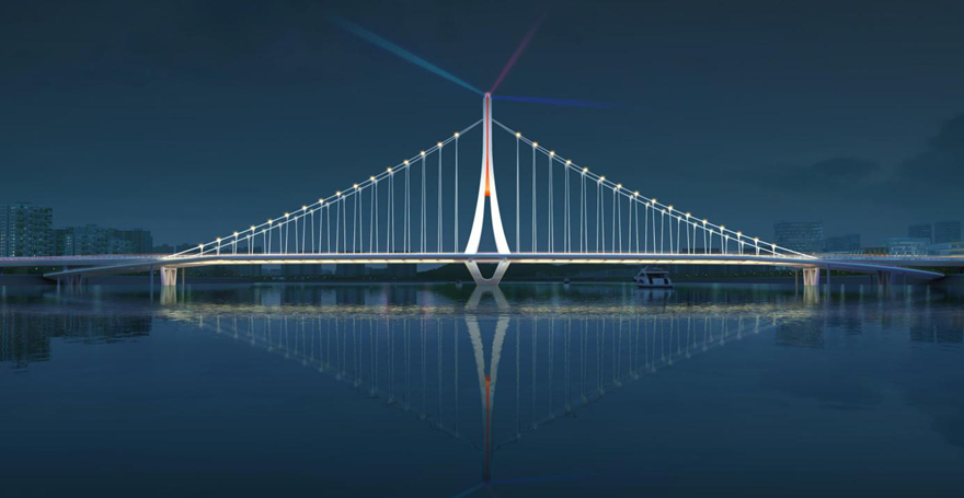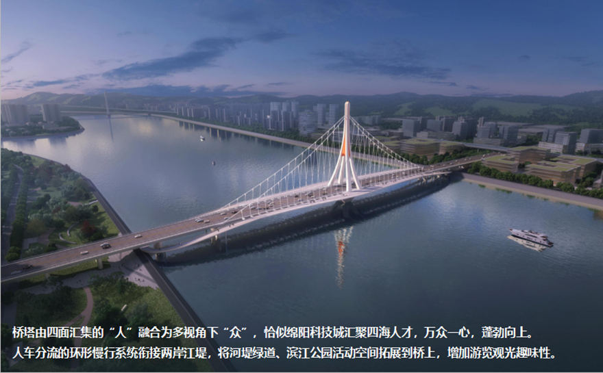 橋梁采用主跨2×156m獨(dú)塔懸索橋。方案以四面匯聚的“人”薈萃為多視角下的“眾”,融洽成“人和”,象征綿陽人杰地靈,吸引四面八方的人才匯聚一堂,萬眾一心,共同點(diǎn)亮屬于中國科技城的燦爛星空。