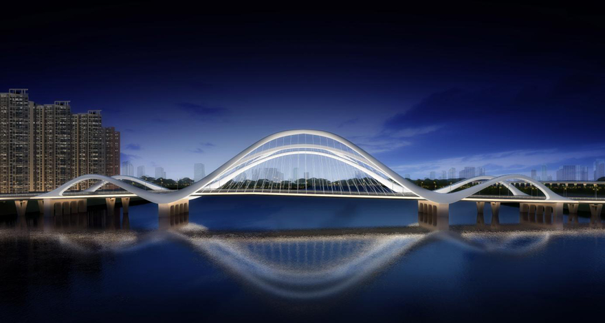 橋梁采用主橋300m下承式系桿拱橋。主拱拱肋具有雕塑感,模仿種子萌芽造型,搭配兩側(cè)小拱,形成眾星捧月之勢(shì),寓意科技創(chuàng)新的萌芽,充分表達(dá)科技城的創(chuàng)新力、生命力。