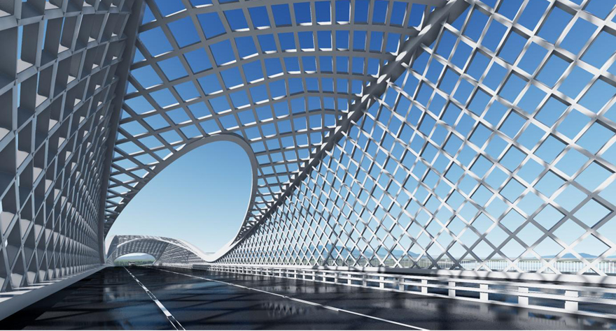 橋梁采用主跨180m 連續(xù)梁橋,橋面設(shè)置層次豐富的空間網(wǎng)狀構(gòu)架,造型設(shè)計(jì)新穎,猶如在時(shí)空之隧中穿梭,體現(xiàn)綿陽科技之城不斷探求未知世界、永攀科技高峰精神。